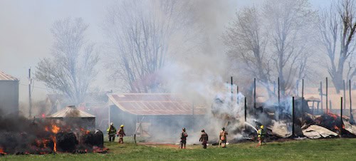 Around 12:30 p.m. on April 6, multiple area fire departments responded to a structure fire in the 8500 block of LL Road, north of Red Bud. A barn, as well as a row of round hay bales were on fire, creating multiple exposures.