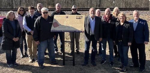 UNVEIL SIGN–Members of the Kaskaskia-Cahokia Trail Coalition and other local officials are pictured at the Jan. 21 unveiling of the sign for the abandoned village of Reily Lake.