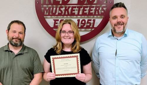 The Red Bud High School Student of the Month is Ariha Root. She is an active student, particularly in music and theater. Root recently achieved two Best of Room awards and first place finishes at the IHSA Solo and Ensemble Contest. She was nominated by band teacher Matt Fisher, who noted that Root is a “kind and amazing young woman, who has been nothing but an asset” in the classroom. The school appreciates the Red Bud Chapter of the Lions Club for supporting the Musketeers and sponsoring this award. Pictured are Fisher, Root and RBHS Principal Alan Guehne.
