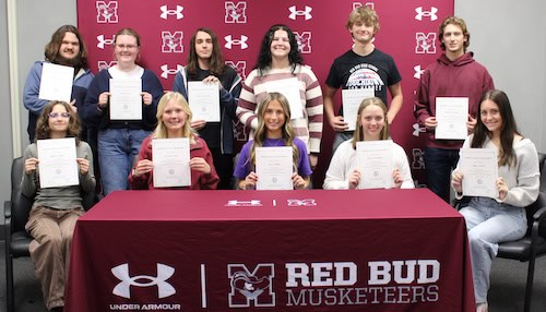 ILLINOIS STATE SCHOLARS–This year, 12 seniors at Red Bud High School were recognized as 2026 Illinois State Scholars by the Illinois Student Assistance Commission. They are: in front: Emma Kiefer, Addy Piel, Ava Wagner, Gracie Shemwell and Emma Carter; in back: Arley Sellers, Ariha Root, John McClellan, Lexi Bievenue, Seth Hohgrefe and Keegan Pflueger. Not pictured is McKenzie Burke.