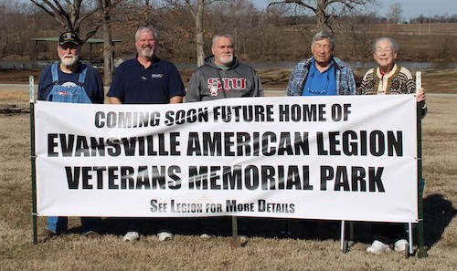 COMING SOON–Those visiting Evansville will now notice a sign noting the future location of the Evansville American Legion Veterans Memorial Park. Pictured on Monday with the sign are memorial park committee members: Erwin “Red” Becker, Barry Greer, Kenny Kempfer, Glen Lemmerman and Marlene Ling. The committee represents members of the American Legion, the American Legion Auxiliary and the village board.