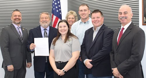 ALLIES IN AGRICULTURE–Pictured at the Randolph County Board meeting after the commissioners approved of the Randolph County Farm Bureau’s Allies in Agriculture resolution are: in front: Commissioners Andy Gerlach and David Holder, Randolph County Farm Bureau Manager Braylee Finck, Farm Bureau Board President Tim Harle and Commissioner Ronnie White; in back: Farm Bureau Board Treasurer Diane Schoenbeck and Board Vice President Michael McConachie.