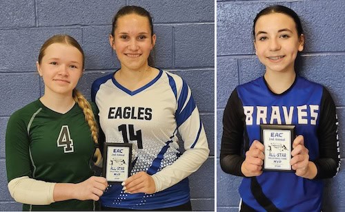 ALL STAR MVPS–Named as the co-MVPs for the A team at the recent Randolph County Volleyball All Star Game were Brynn Westerman of the Red Bud Catholic-Trinity co-op, at left, and Avery Jones of Evansville Attendance Center. The MVP for the B team was Charli Sternburg of Steeleville, at right.