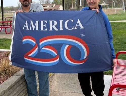 In honor of America’s 250 anniversary and Red Bud’s celebration for the nation’s 250th in August, the Red Bud Auxiliary to VFW Post 6632 donated an America’s 250 flag for the flag pole at Lincoln Park. The flag pole itself was donated by the Red Bud VFW Auxiliary in 1999 in commemoration of the 100th anniversary of the VFW. Pictured presenting the flag to Red Bud City Superintendent Josh Eckart is Red Bud Auxiliary Senior Vice President Kathryn Rowold.