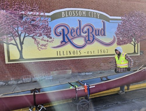 PASSING THROUGH–Pictured is canoeist Peter Frank as he passed through Red Bud on Thanksgiving morning. He was portaging his canoe through the area as part of his effort to complete the Great Loop.
