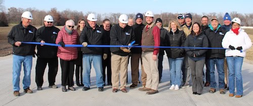 HELD RIBBON CUTTING–Pictured at the ribbon cutting for the new entrance road at KRPD #2 are: Terry Liefer, Ron Kaempfe, Linda Tragesser, Lauren Bonner, Bob Myerscough, Katie Main, Ed Weilbacher, Mark Wilson, Dave Ogle, Brent Donovan, Kevin Voges, Chris Herrmann, Randy Muench, Eric Fritsche, Claire Grob, Josh Froesse, Mark Rujawitz, David Holloway and Anna Guebert.