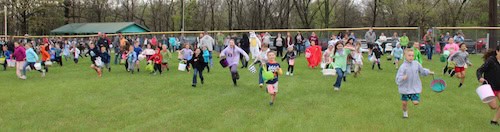 Pictured are some of the older children, racing to get eggs, at the annual Evansville Fire Department Egg Hunt. Due to the weather, this year’s hunt was postponed for about an hour and moved onto the outfield of the ball diamond. The firemen said they had 135 children participate, and each got to take home at least 14 eggs and a basket.