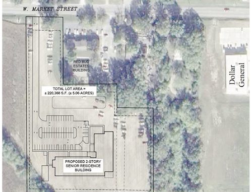 SITE PLAN–Pictured is one of the presented site plans for Lincoln Park Place, a new senior living community to be built off of West Market Street. (Text noting a few of the surrounding structures have been added to help clarify the site location.)