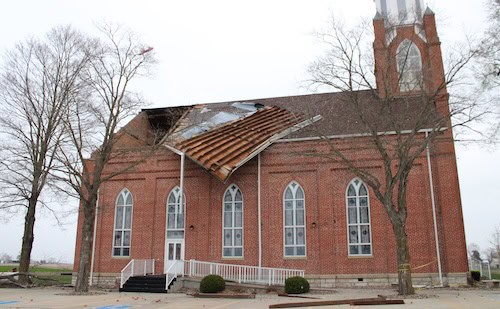 STORM DAMAGE–The roof on Trinity Lutheran Church in Prairie was damaged by an EF-0 tornado that passed through the area on Sunday evening. Pictured is the church on Monday morning as crews were beginning to assess the damage.